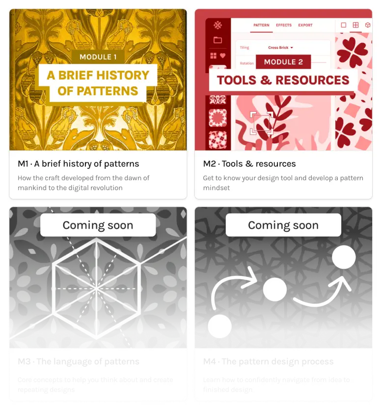 Video tutorials, in-depth articles, and a complete free course on pattern design. From your first repeat to selling your work.