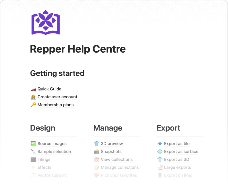 Need some help to get going, or get the most out of Repper? The help centre covers every part of Repper: source images, pattern creation, exporting, and more.